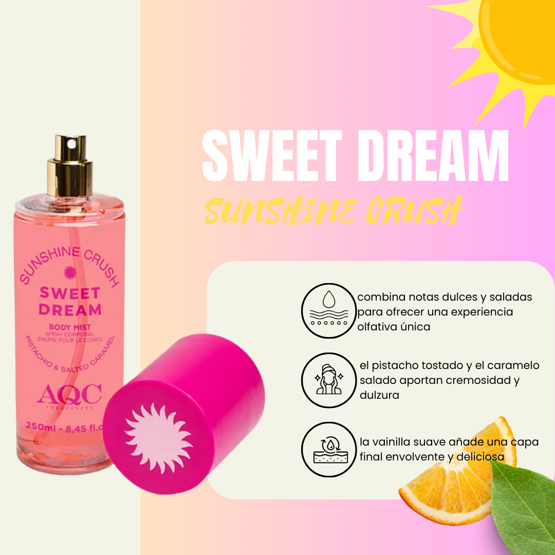 Descubre la bruma corporal Sunshine Crush de la línea Sweet Dream: una fragancia adictiva que combina pistacho tostado, caramelo salado y vainilla suave. Su fórmula ligera y de rápida absorción es perfecta para usar tanto en el cuerpo como en el cabello, sin dejar sensación grasa.