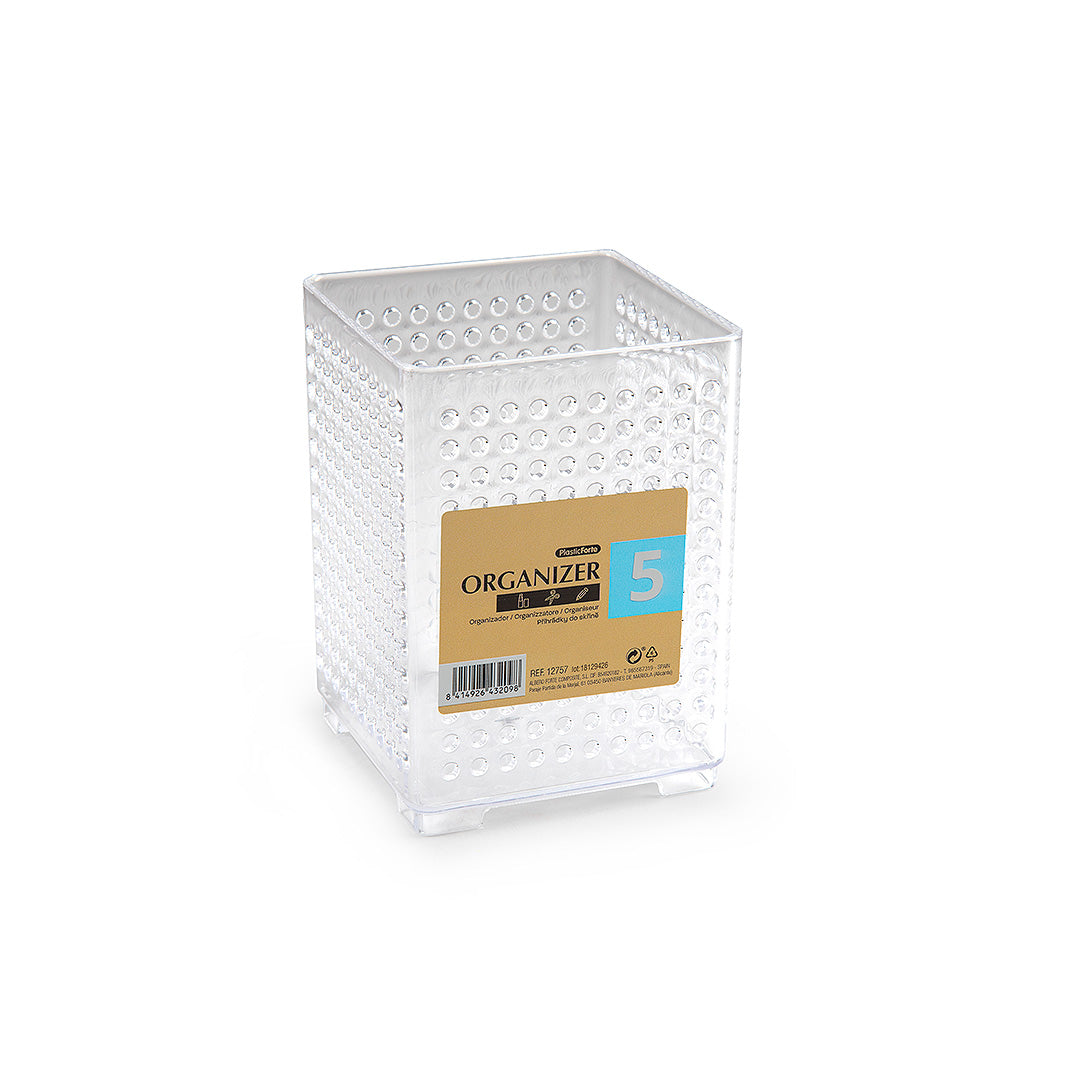 El organizador de escritorio Plastic Forte N5, fabricado en plástico PF resistente, ofrece una solución práctica y duradera para mantener tu espacio de trabajo ordenado. Con unas medidas compactas de 7.5 x 7.5 x 10.5 cm y un diseño transparente, permite visualizar fácilmente su contenido, facilitando el acceso rápido a tus materiales de oficina. Ideal para optimizar la organización sin sacrificar espacio ni estilo.